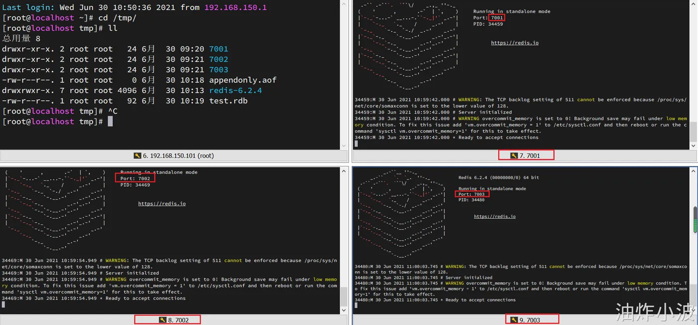 为了方便查看日志,我们打开3个ssh窗口,分别启动3个redis实例,启动命令(在/tmp目录执行下列命令):