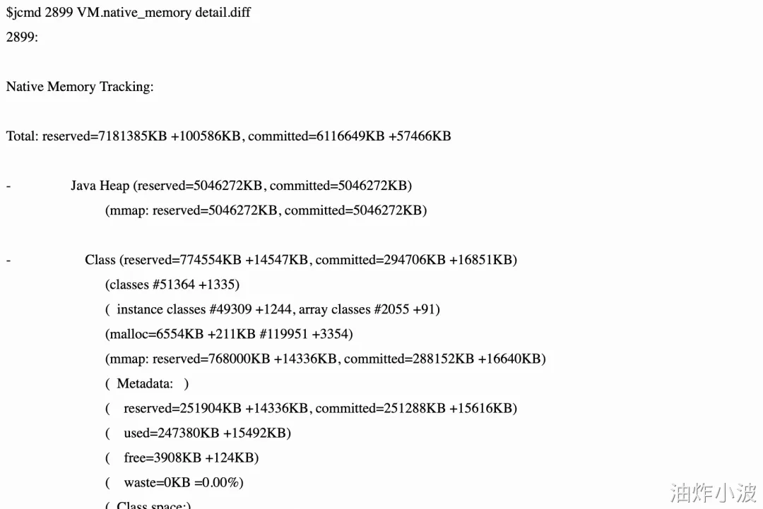 # 对比当前内存与基线数据jcmd <PID> VM.native_memory summary.diff