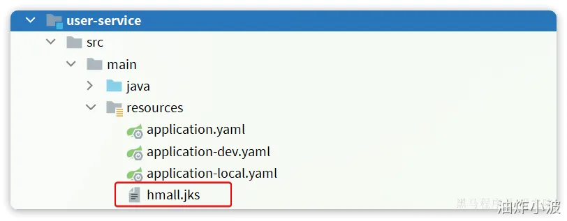 将hm-service下的hmall.jks文件拷贝到user-service下的resources目录,这是JWT加密的秘钥文件: