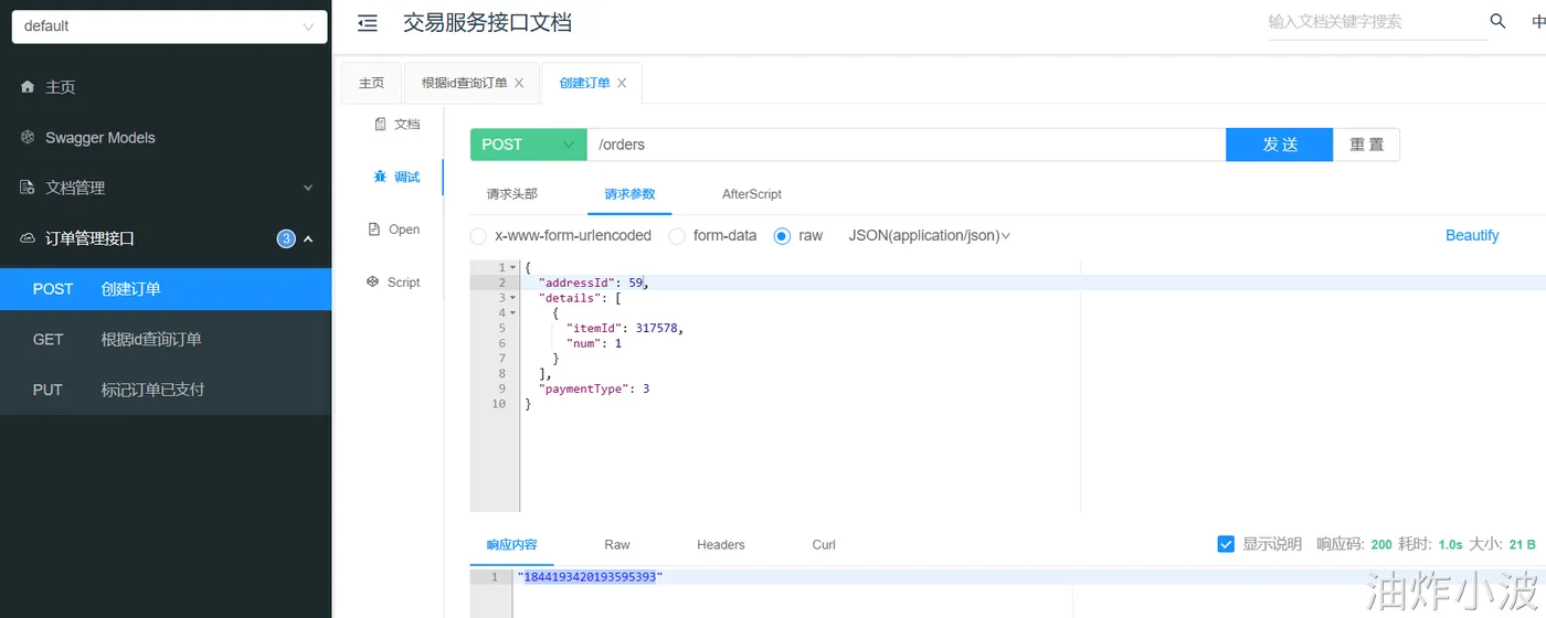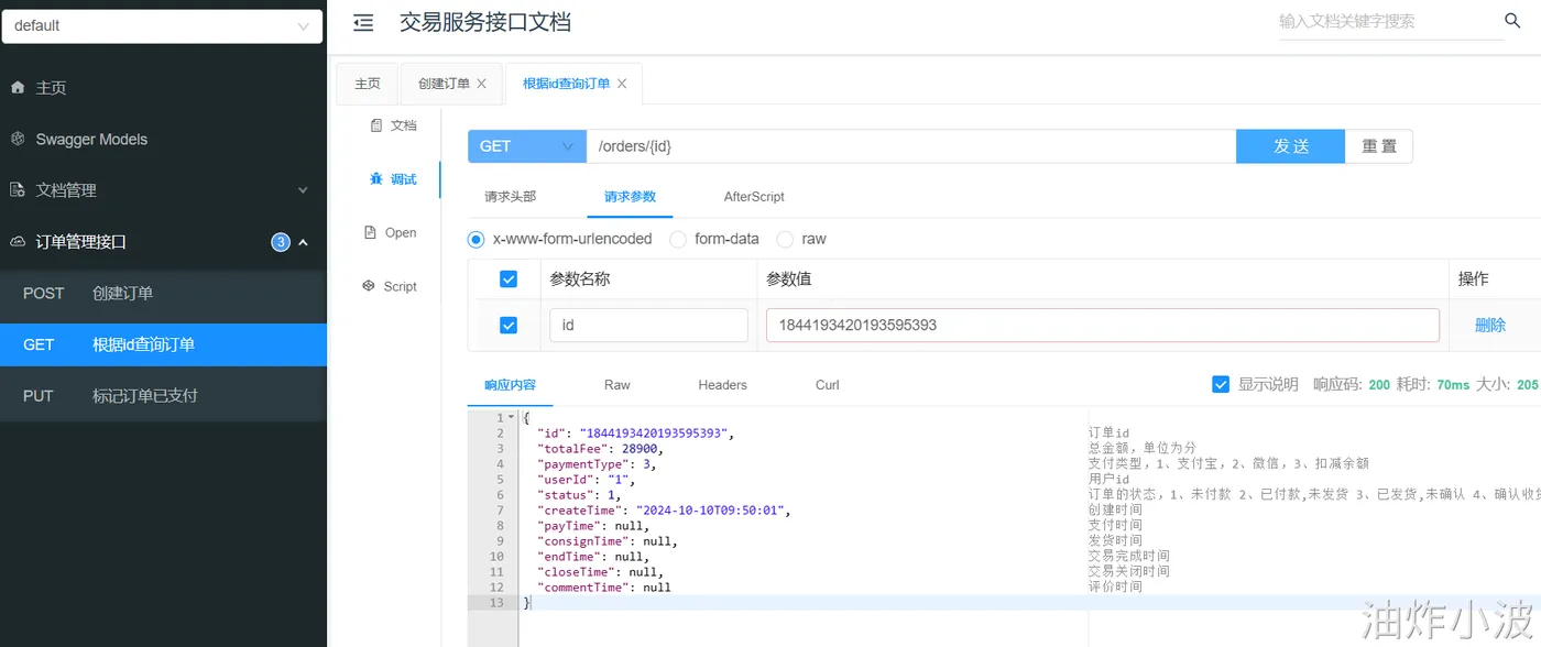 使用上个测试返回的订单ID测试查询订单信息接口。