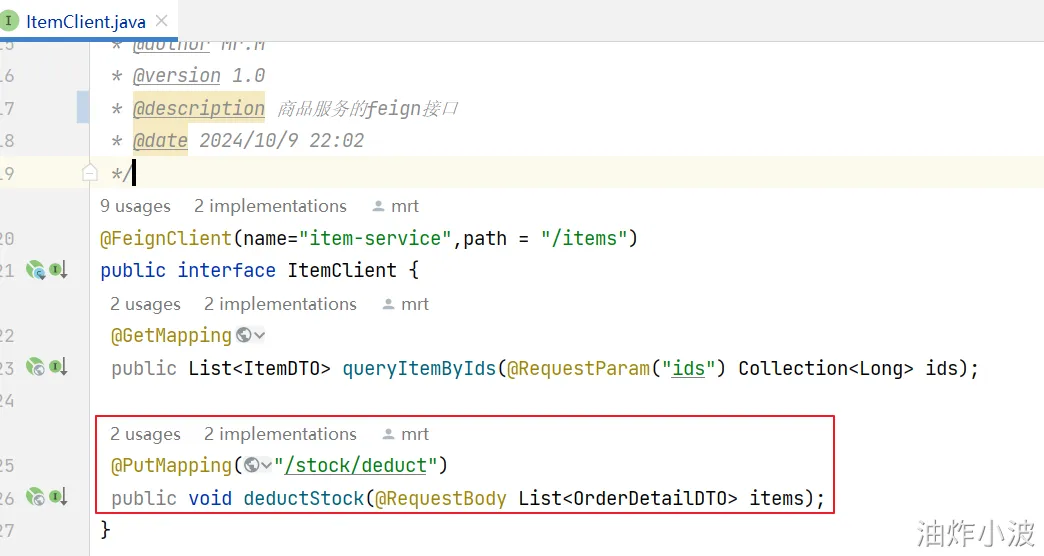 首先是扣减库存,在item-service中的对应业务接口如下: