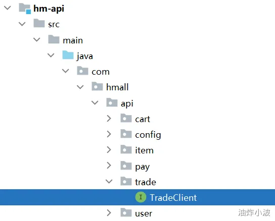 我们将这个接口抽取到hm-api模块的com.hmall.api.trade.TradeClient中: