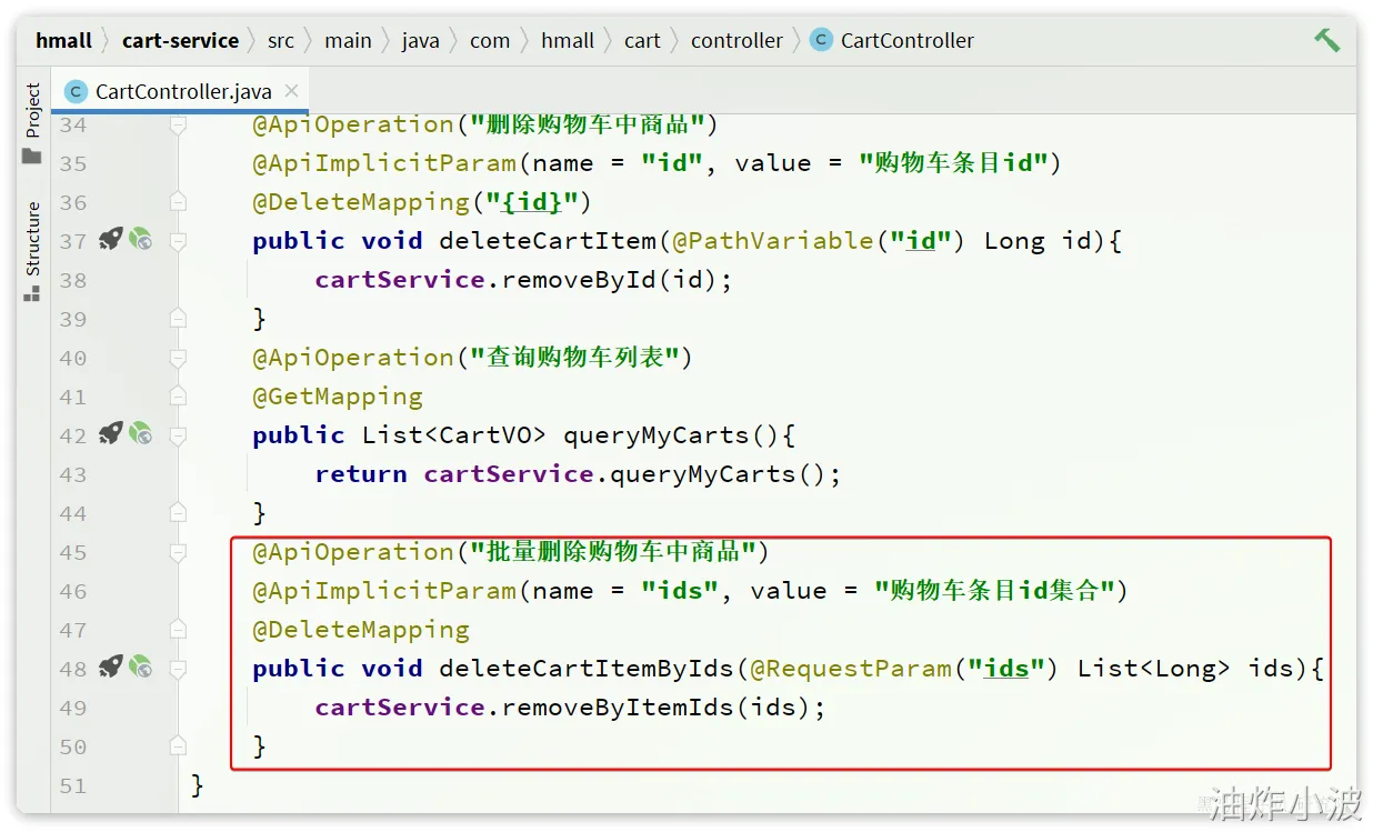 接下来是清理购物车商品,在cart-service中的对应业务接口如下:
