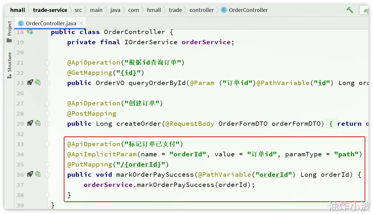 接下来是标记订单状态,在trade-service中的对应业务接口如下:
