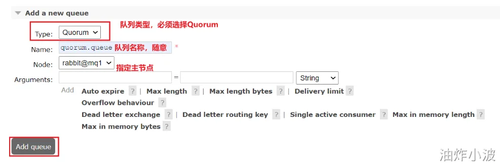 在任意控制台添加一个队列,一定要选择队列类型为Quorum类型。