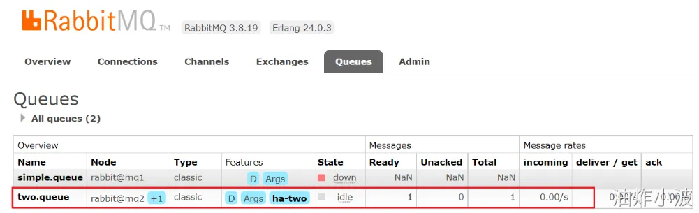 可以看到,仲裁队列的 + 2字样。代表这个队列有2个镜像节点。