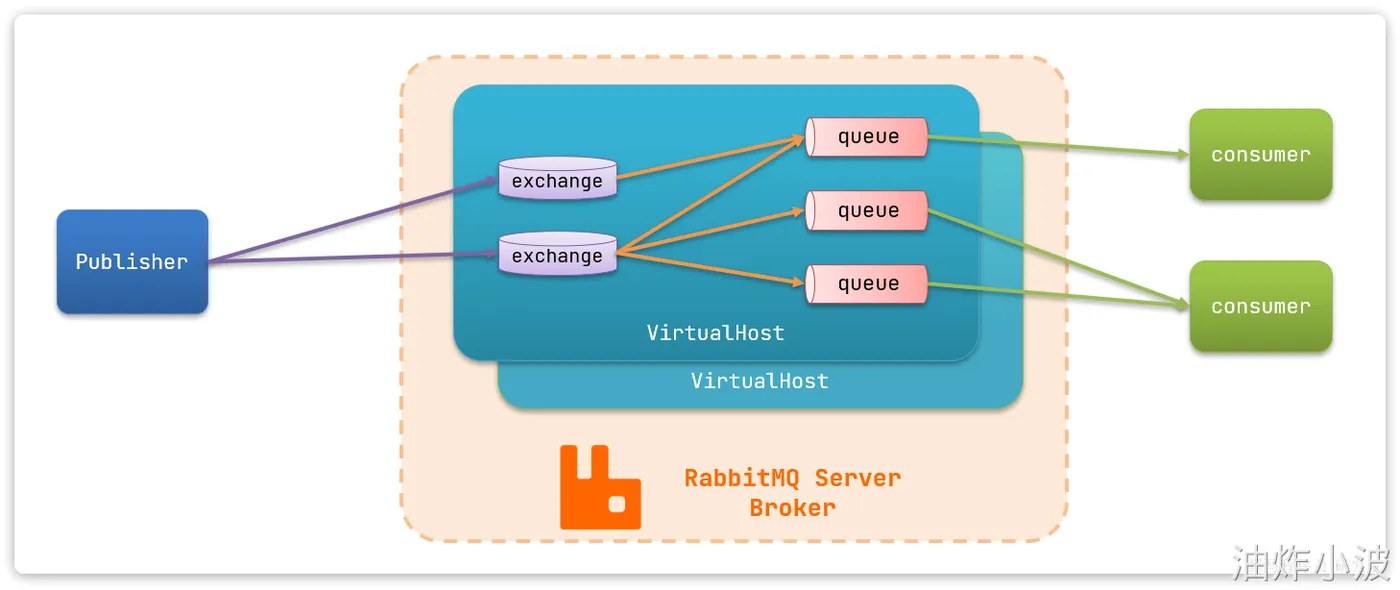 publisher:生产者,也就是发送消息的应用程序consumer:消费者,也就是消费消息的应用程序queue:队列,存储消息的缓冲区。生产者投递的消息会暂存在消息队列中,等待消费者处理exchange:交换机,负责消息路由。生产者发送的消息由交换机决定投递到哪个队列。virtual host:虚拟主机,起到数据隔离的作用。每个虚拟主机相互独立,有各自的exchange、queue
