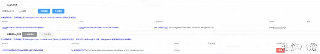 引入git-poison后,在团队的发布流程中,发布平台会调用git-poison自动导入本次版本发布的“Bugfix列表”和“未修复Bug列表”,便于发布经理评估该版本的质量风险,无需再口头追个确认。包括本次发布修复的问题列表,以及是否有未解决的bug。