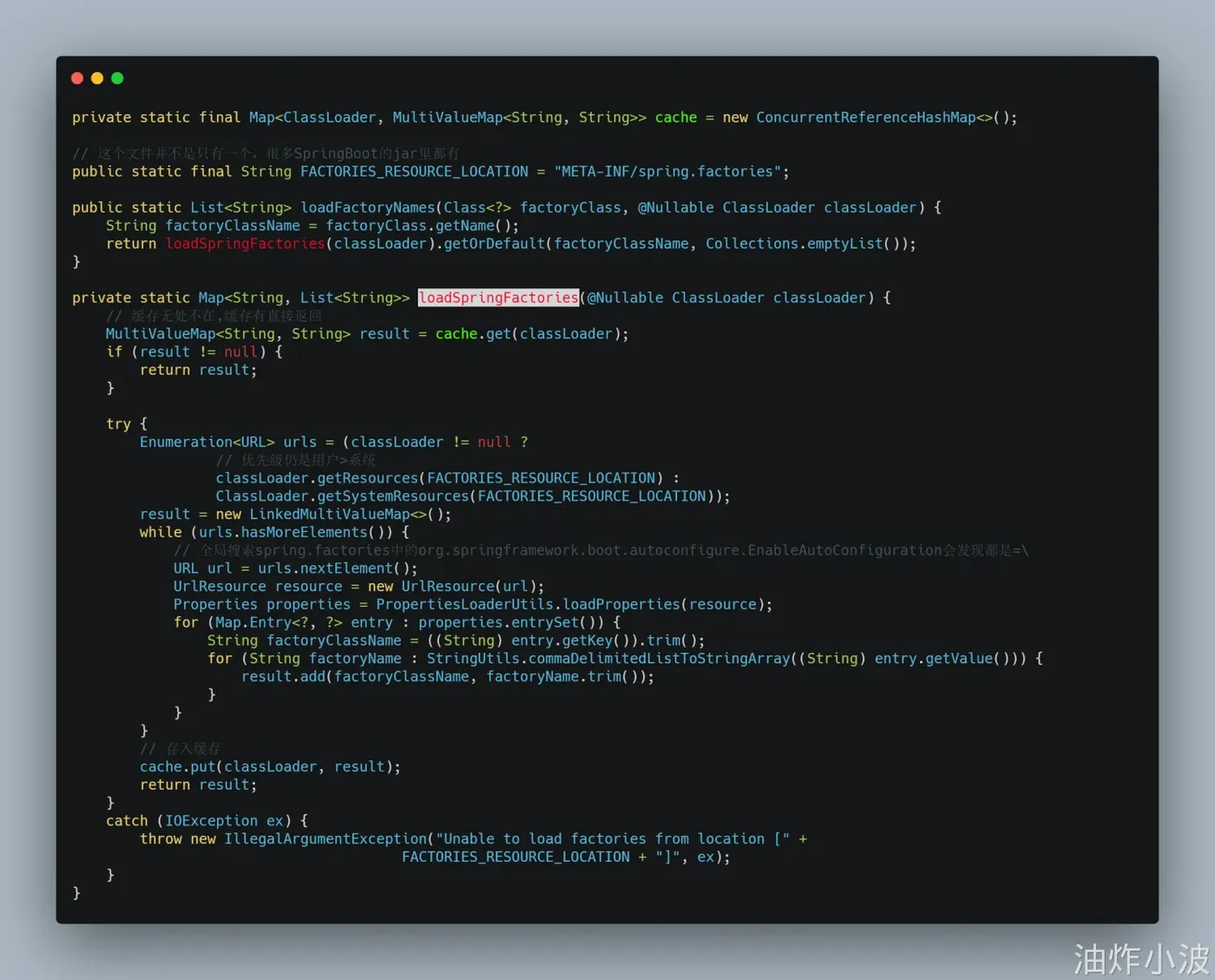 @EnableAutoConfiguration是自动化配置的核心,标识开启自动配置,是一个派生注解,其两个核心:@AutoConfigurationPackage帮助完成Bean注册,获取全部去重的packageNames;@AutoConfigurationImportSelector核心是借助于ImportSelector接口的selectImport方法实现,层层调用之后,最终会获取spring.factories文件下的配置信息,取到EnableAutoConfiguration指定的值,将这些值作为自动配置类导入到容器中,自动配置类就生效,帮我们进行自动配置工作。以前我们需要自己配置的东西,自动配置类都帮我们完成了。