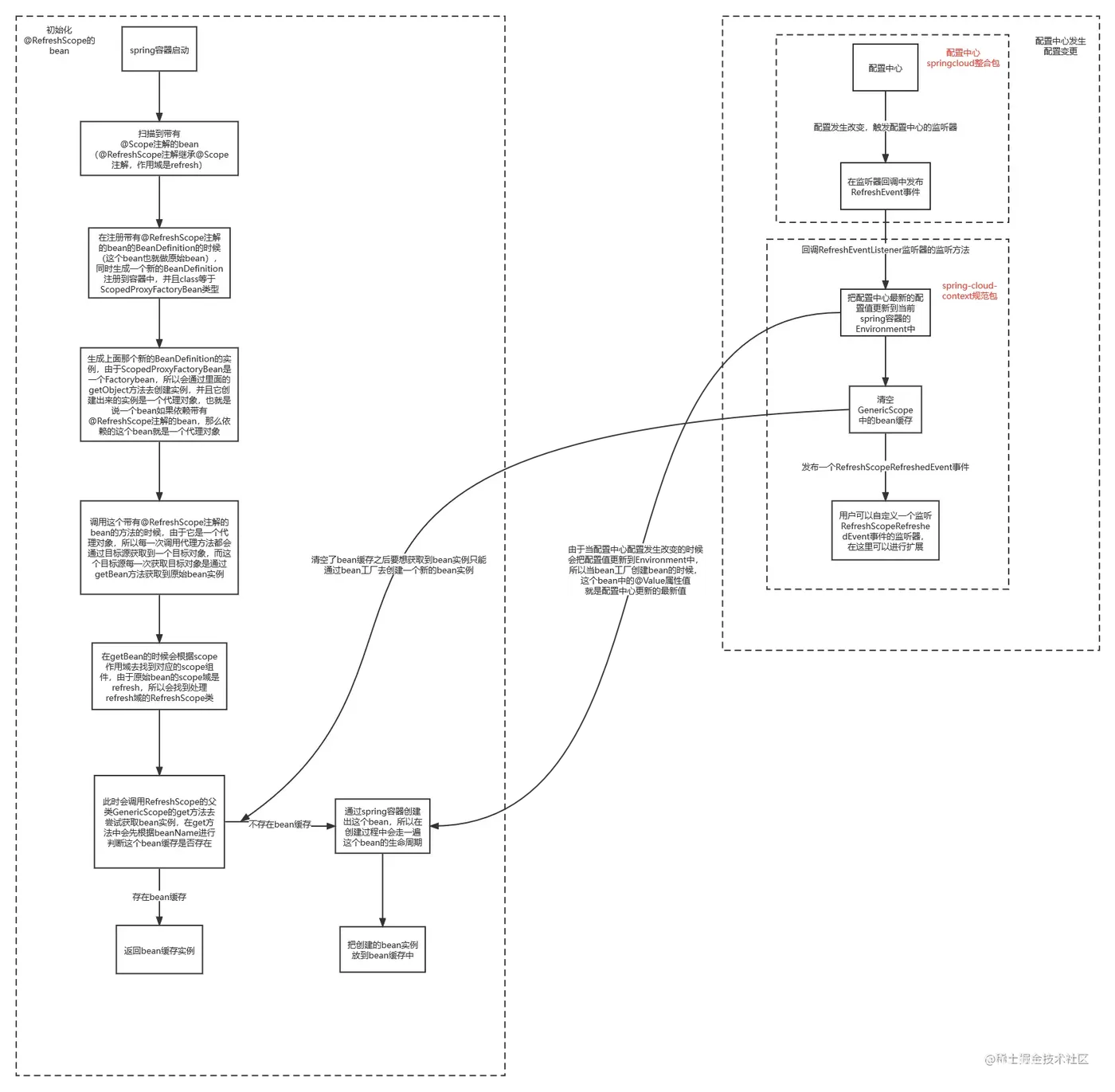 对于@RefreshScope注解实现配置热更新的流程,实际是借助于缓存失效+Spring重新创建配置Bean解决,知道这个思路之后,读者们可以借助本章节2,或3做流程性、原理性了解。
