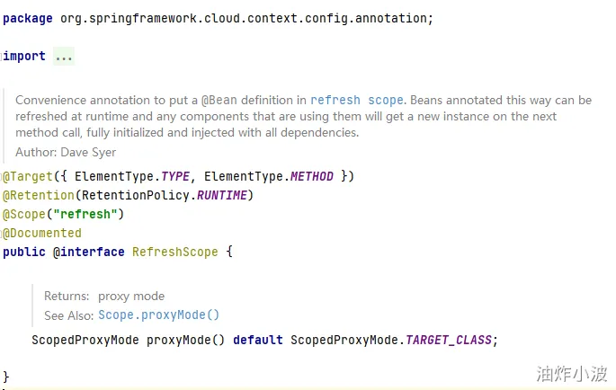所以截止目前我们可以了解到:@RefreshScope注解本身是一个组合注解,其实现配置热更新的关键是依赖@Scope("refresh")。我们进一步来看看@RefreshScope到底做了什么?