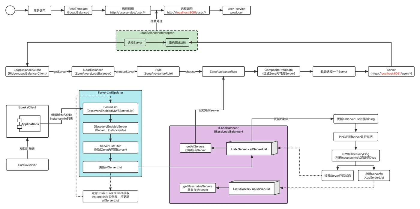 Ribbon与大多数负载均衡实现机制一样在客户端实现(不同于后续我们讲解的Nacos,Nacos在服务端实现),其主要流程为: