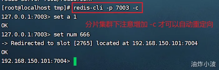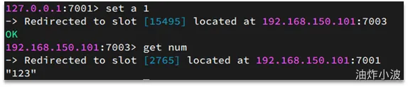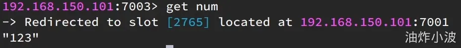 到了7003后,执行get num时,对num做hash运算,对16384取余,得到的结果是2765,因此需要切换到7001节点【即:不止存储会做插槽计算和重定向,查询也会做】