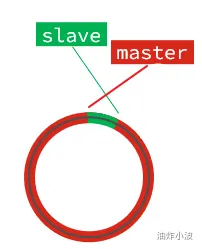 此时,如果有新的数据写入,就会覆盖数组中的旧数据。不过,旧的数据只要是绿色的,说明是已经被同步到slave的数据,即便被覆盖了也没什么影响。因为未同步的仅仅是红色部分。但是,如果slave出现网络阻塞,导致master的offset远远超过了slave的offset: