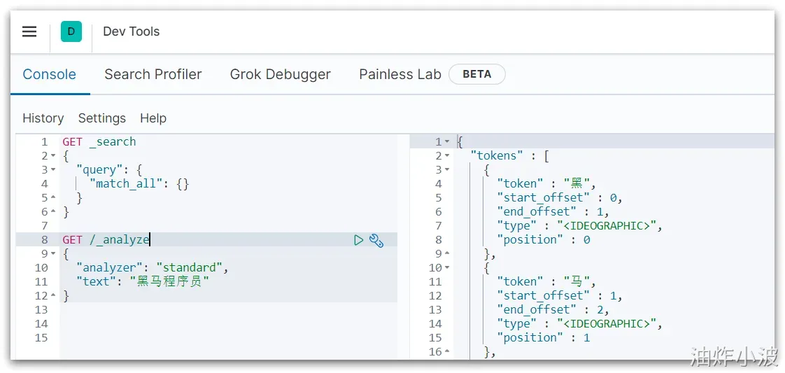 输入之后,有一个执行的按钮,执行一下就有下述的效果(这时候就已经测试出了默认分词器的效果):