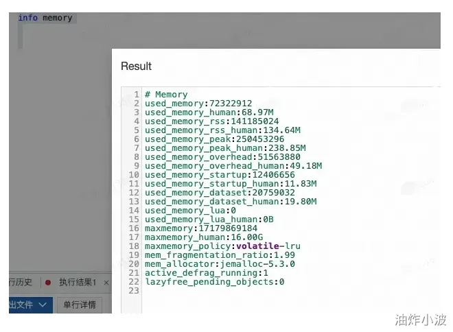 从上面的 INFO memory 输出中,我们可以看到一些关键信息,这些信息表明大部分内存被缓冲区占用殆尽: