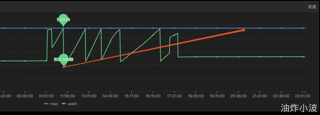 其中一个现象是每次gc后的最小内存正在逐步变大,对应上述步骤中第二步,内存正在逐步膨胀。