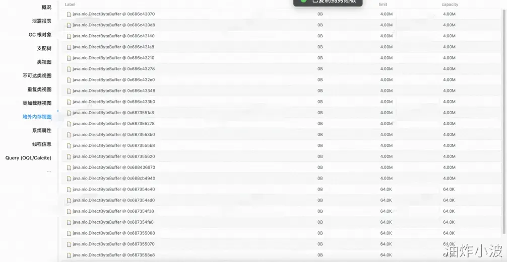 使用集团内部的MAT文件,分析了Dump文件,发现堆外内存中都是java.nio.DirectByteBuffer。