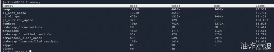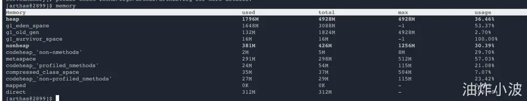 使用Arthas 的 memory 命令分析了系统的内存分布,结果如下:
