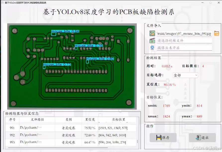 深度学习技术的突破为PCB缺陷检测提供了新思路。YOLOv8作为最新一代单阶段目标检测算法,凭借其高精度、高速度与强泛化能力,在工业缺陷检测领域展现出巨大潜力。其改进的骨干网络与特征融合机制可有效捕捉PCB图像中的微小缺陷特征,而PyQt5作为跨平台GUI开发框架,能够快速构建用户友好的操作界面,实现检测结果的可视化与交互。基于YOLOv8与PyQt5的PCB缺陷检测系统,可显著提升检测效率与准确性,降低对专业设备的依赖,为电子制造企业提供智能化、低成本的质检解决方案,推动行业向自动化、数字化方向升级。