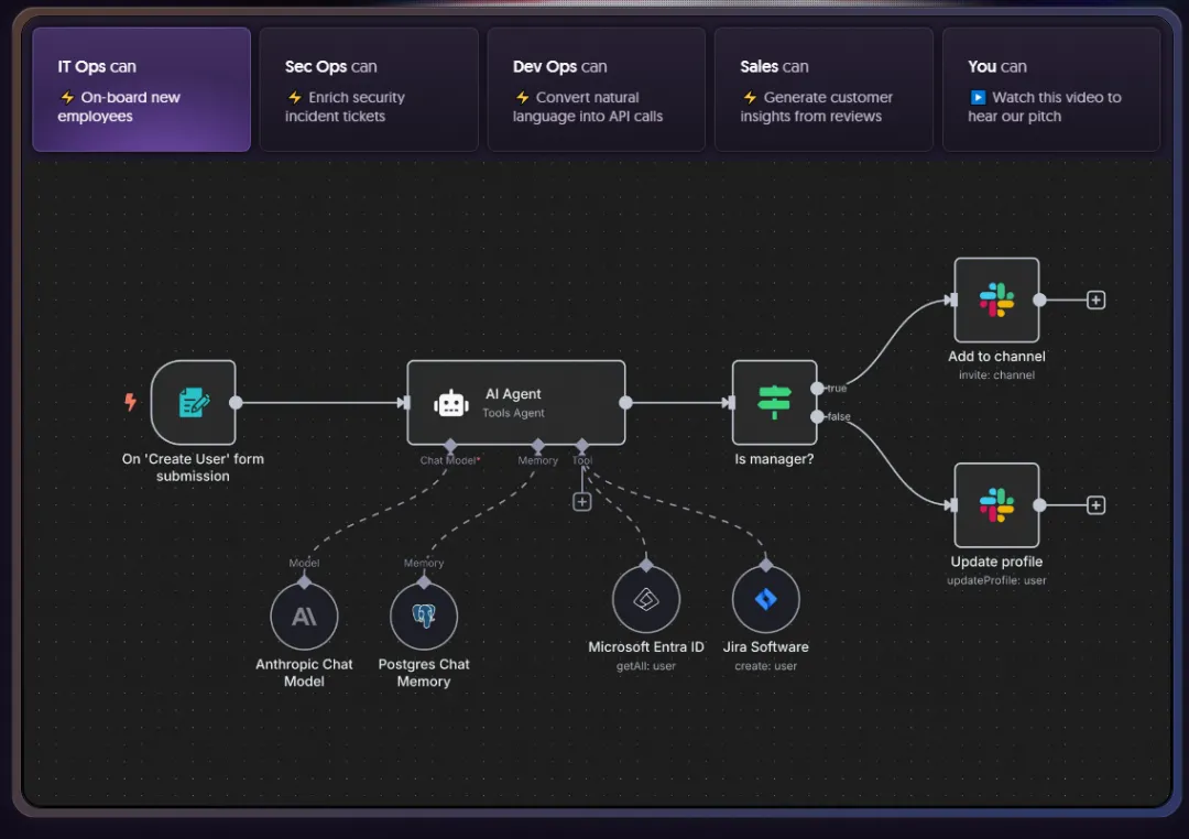 - 内置 GitHub、Slack、Telegram、Notion、Google Sheets、MySQL、Postgres、HubSpot 等各种节点