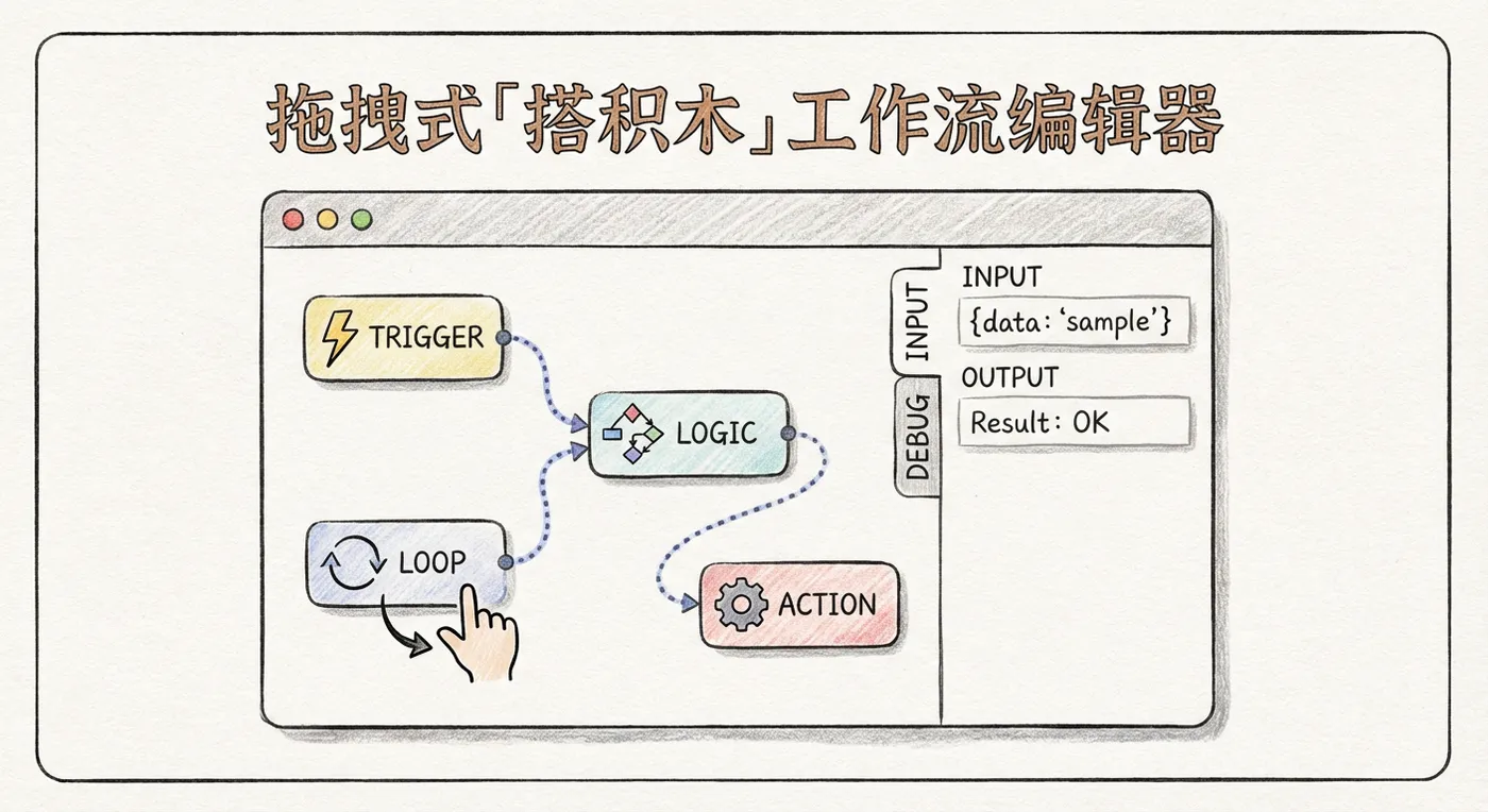 - 完整的可视化画布,节点之间拖线连一连,就能搭出复杂流程