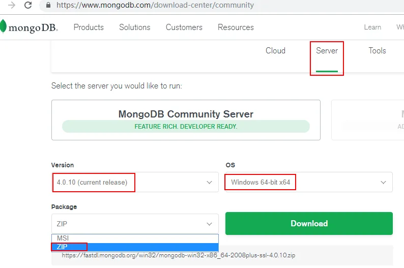 (1)先到官网下载压缩包 mongod-linux-x86_64-4.0.10.tgz 。