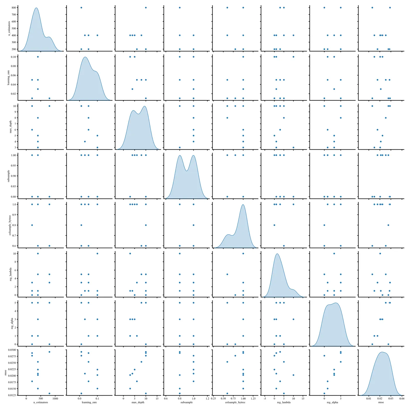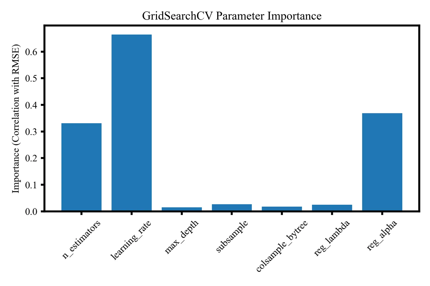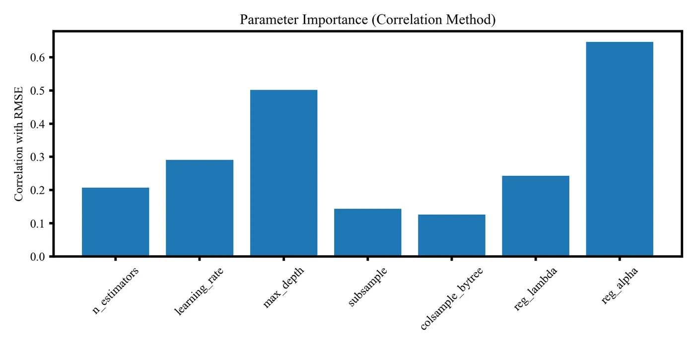 该图展示 GridSearchCV 调参过程中各超参数与 RMSE 的相关性重要性,其中 learning_rate、reg_alpha 和 n_estimators 影响最明显,可用于识别关键参数并指导后续调参方向。