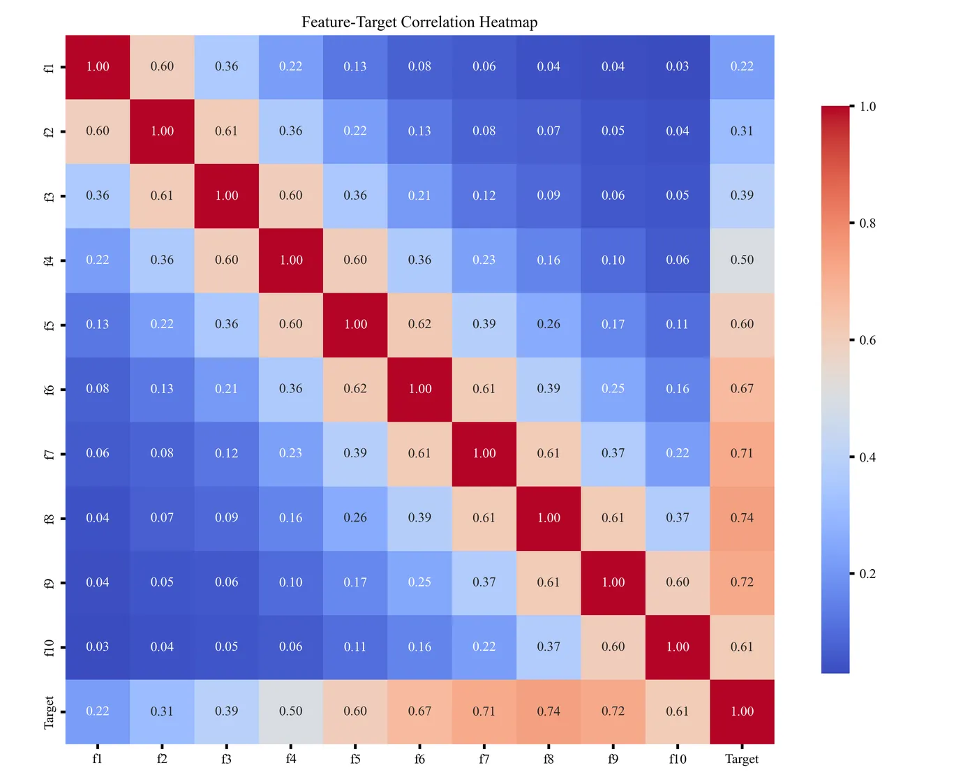 特征值相关性热图用于展示各特征之间的相关强弱,通过颜色深浅体现正负相关关系,帮助快速识别冗余特征、强相关特征及可能影响模型稳定性的变量,为后续特征选择和建模提供参考。