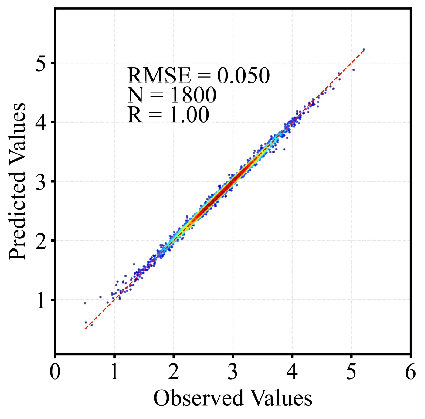 散点密度图通过颜色或亮度反映点的聚集程度,用于展示大量样本的分布特征。相比普通散点图,它能更直观地呈现高密度区域、异常点及整体趋势,常用于回归分析与模型评估。以下为训练集和测试集出图效果。