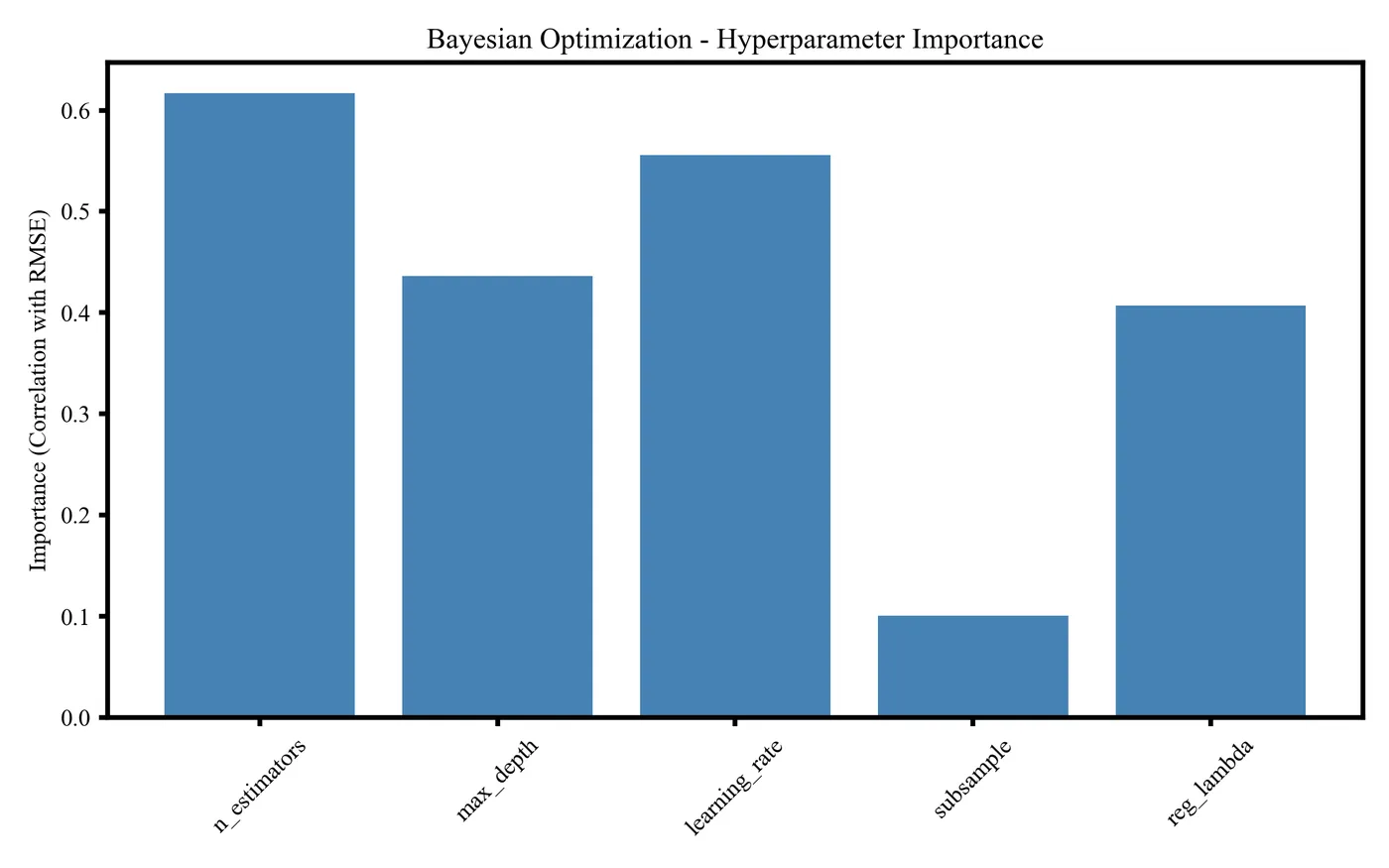 该图展示贝叶斯优化过程中各超参数的重要性,对模型误差影响最大的为 n_estimators 和 learning_rate,其次为 max_depth,而 subsample 与 reg_lambda 贡献较小,用于判断调参优先级。