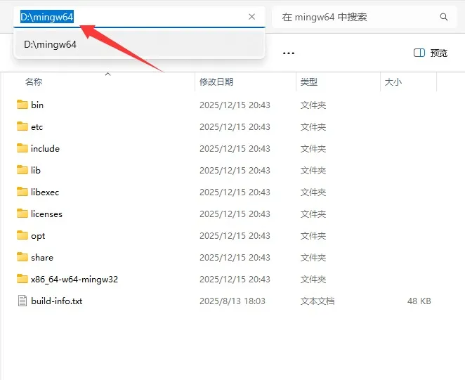 2) 解压下载的压缩包,比如我将其解压后放到 D 盘的 Mingw64 文件夹里(路径是 D:\mingw64):