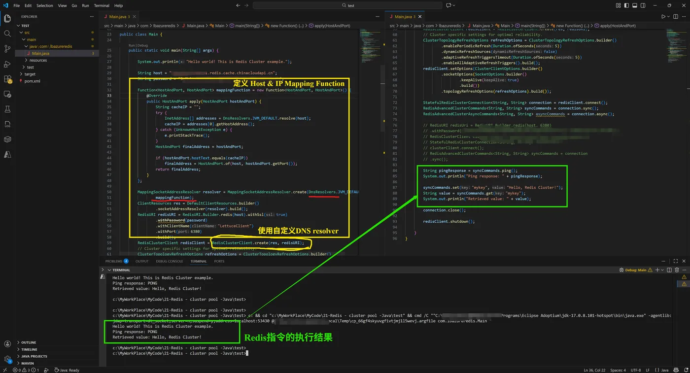 Function<HostAndPort, HostAndPort> mappingFunction = new Function<HostAndPort, HostAndPort>() { public HostAndPort apply(HostAndPort hostAndPort) { String cacheIP = ""; try { InetAddress[] addresses = DnsResolvers.JVM_DEFAULT.resolve(host); cacheIP = addresses[0].getHostAddress(); } catch (UnknownHostException e) { e.printStackTrace(); } HostAndPort finalAddress = hostAndPort; if (hostAndPort.hostText.equals(cacheIP)) finalAddress = HostAndPort.of(host, hostAndPort.getPort()); return finalAddress; } }; MappingSocketAddressResolver resolver = MappingSocketAddressResolver.create(DnsResolvers.JVM_DEFAULT, mappingFunction); ClientResources res = DefaultClientResources.builder() .socketAddressResolver(resolver).build(); RedisURI redisURI = RedisURI.Builder.redis(host).withSsl(true) .withPassword(password) .withClientName("LettuceClient") .withPort(6380) .build(); RedisClusterClient redisClient = RedisClusterClient.create(res, redisURI);
