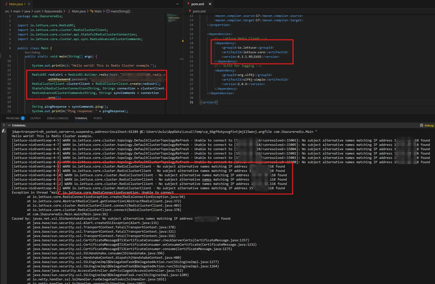 使用Azure Cache for Redis的集群模式。应用客户端为Java代码,使用Lettuce 作为Redis 客户端SDK。启动项目报错:Caused by: java.security.cert.CertificateException: No subject alternative names matching IP address 159.27.xxx.xxx found。