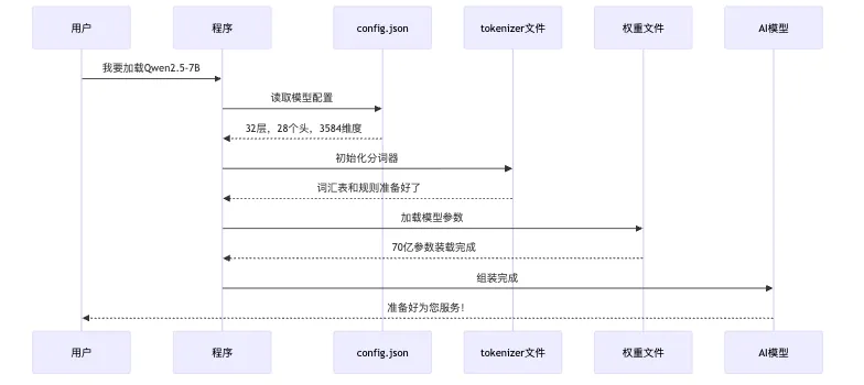 // config.json 就像员工档案 { "model_type": "qwen2", // 什么类型的AI "hidden_size": 3584, // 大脑容量有多大 "num_attention_heads": 28, // 注意力有多集中 "num_hidden_layers": 32, // 思考有多深 "vocab_size": 151936 // 认识多少个词 }