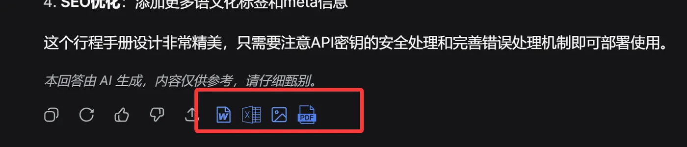 安装这个扩展后,DeepSeek 的每一条回复下方都会出现一排简洁的导出图标。
