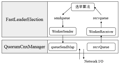 上图展示了FastLeaderElection模块是如何与底层网络I/O进行交互的。