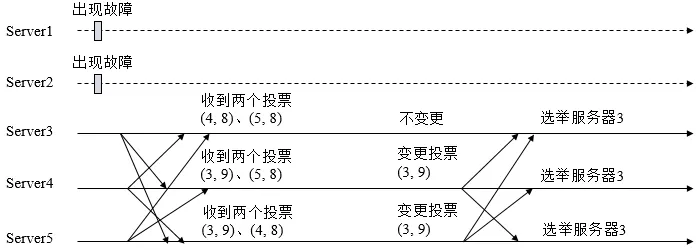 (4) 统计投票。每次投票后,服务器都会统计投票信息,判断是否已经有过半机器接受到相同的投票信息,对于Server1、Server2而言,都统计出集群中已经有两台机器接受了(2, 0)的投票信息,此时便认为已经选出Leader。
