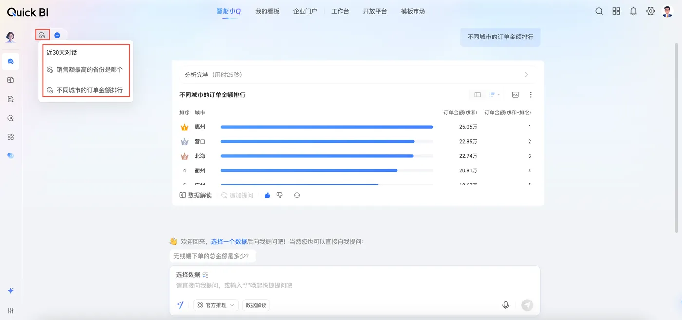 - 小Q解读 Agent(智能解读):对已有仪表板或报表进行 自动洞察分析,识别关键波动、异常点、趋势变化。生成 可读性强的归因报告,例如:“销量下降15% 主要由于A类商品库存不足及促销活动未覆盖重点区域”。帮助业务人员快速抓住数据背后的故事,而非仅看数字。