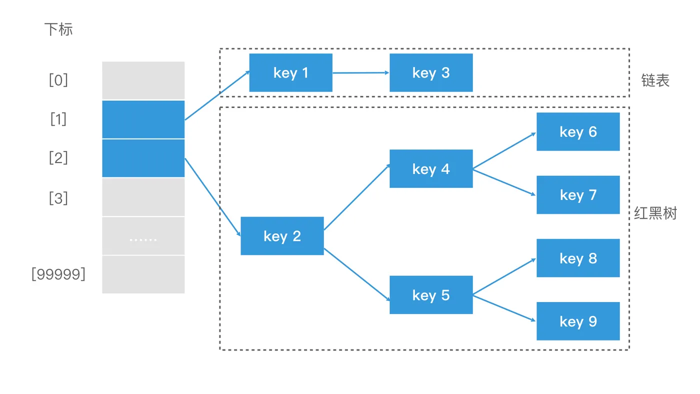 第二阶段,将数组下标所存的链表头或树根取出。如果是链表,就使用遍历的方式查找,这部分查询的时间代价是 O(n)。由于链表长度是有上限的,因此实际开销并不会很大,可以视为常数级别时间。如果是红黑树,则用二分查找的方式去查询,时间代价是 O(log n)。如果哈希表中冲突的元素不多,那么落入红黑树的数据规模也不会太大,红黑树中的检索代价也可以视为常数级别时间。