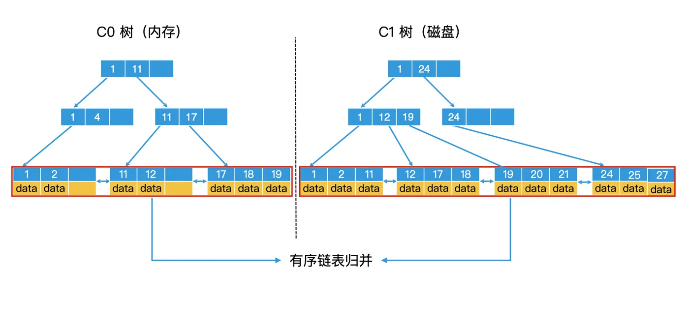 C0 树和 C1 树滚动合并可以视为有序链表归并