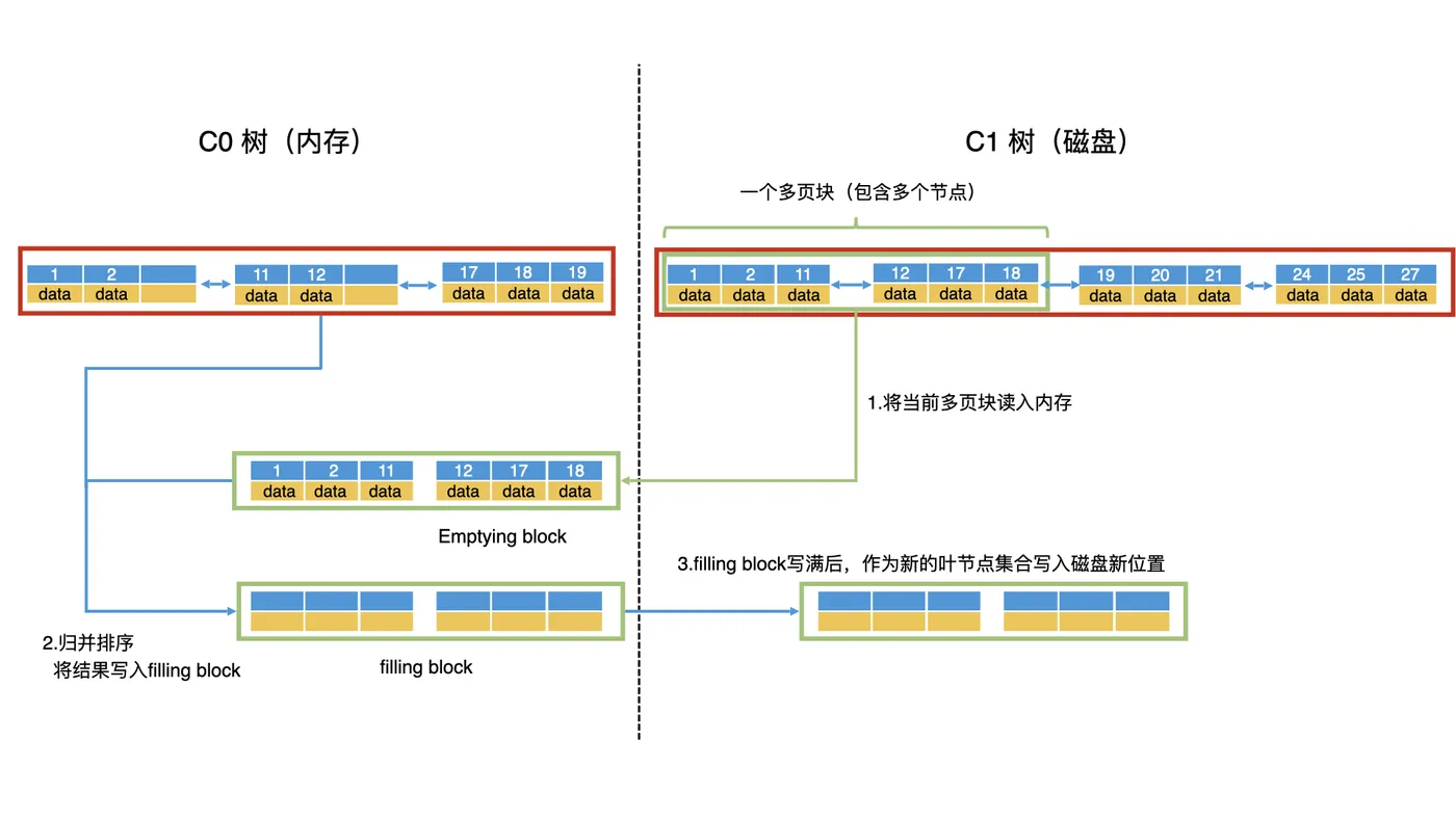 - 第一步,以多页块为单位,将 C1 树的当前叶子节点从前往后读入内存。读入内存的多页块,叫作清空块(Emptying Block),意思是处理完以后会被清空。