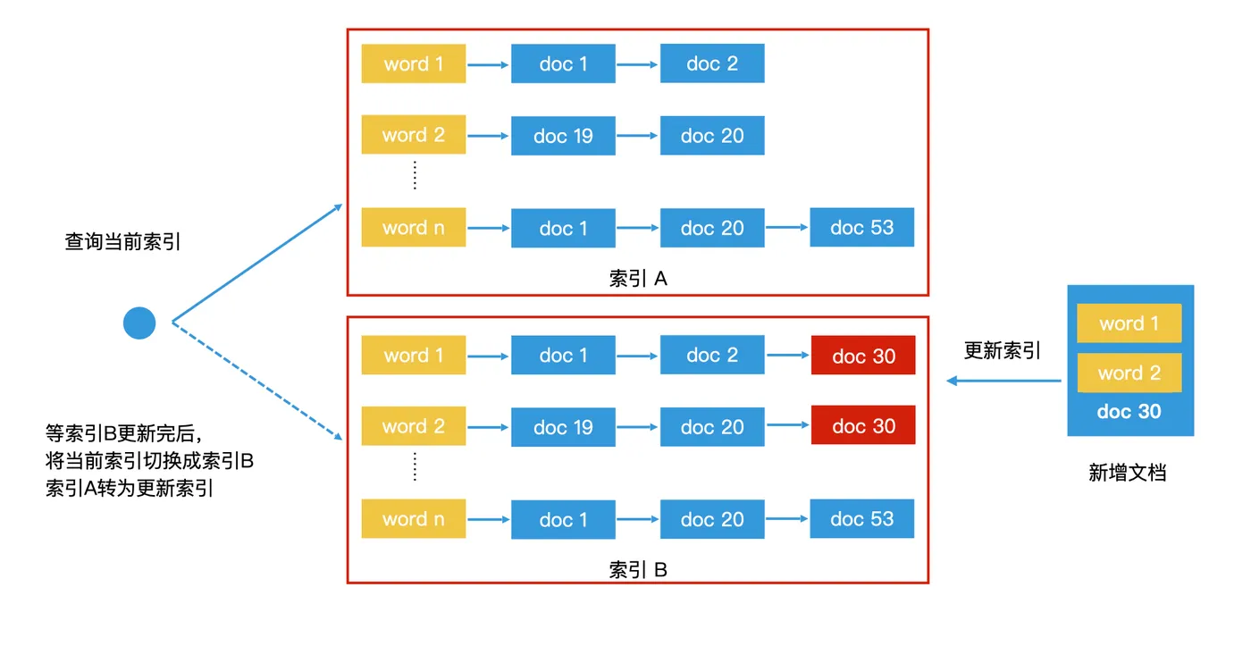 通过这样的机制,我们就能同时维护两个倒排索引,保持一个读、一个写,并且来回切换,最终完成高性能的索引更新。不过,为了避免切换太频繁,我们并不是每来一条新数据就更新,而是积累一批新数据以后再批量更新。这就是工业界常用的 Double Buffer 机制。