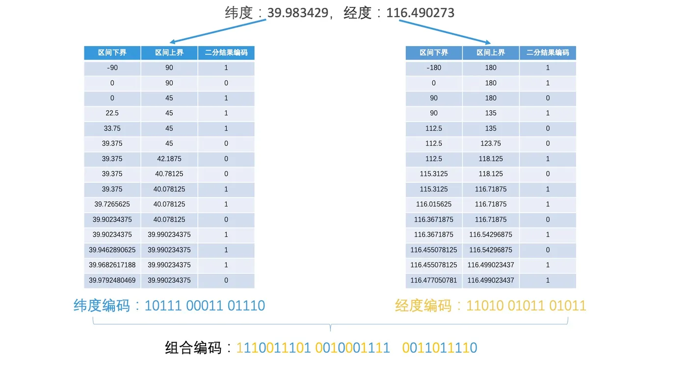 - 在纬度方向上,第一次二分,39.983429 在[0,90]之间,[0,90]属于空间的上半边,因此我们得到编码 1。然后在[0,90]这个空间上,第二次二分,39.983429 在[0,45]之间,[0,45]属于区间的下半边,因此我们得到编码 0。两次划分之后,我们得到的编码就是 10。
