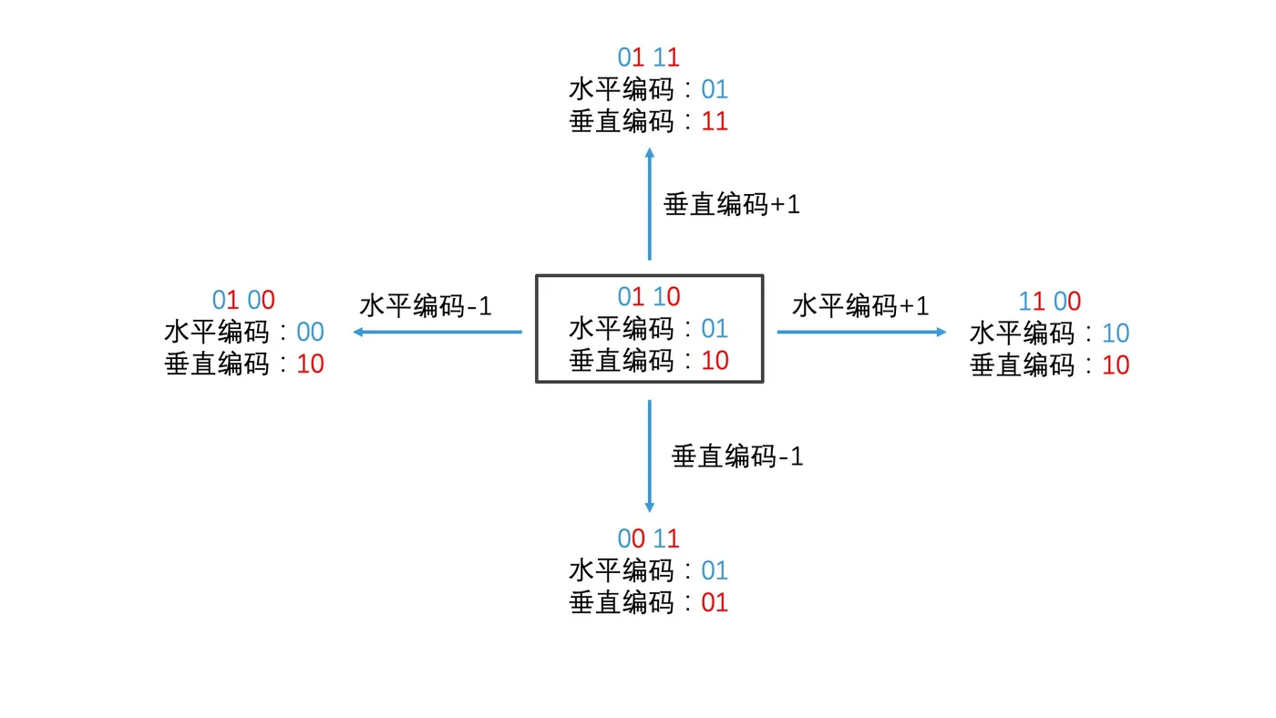 知道了要查询的区域有哪些,那我们怎么快速寻找这些区域的编码呢?这就要回到我们区域编码的方案本身了。前面我们说了,区域编码可以根据奇偶位拆成水平编码和垂直编码这两块,如果一个区域编码是 0110,那它的水平编码就是 01,垂直编码就是 10。那该区域右边一个区域的水平编码的值就比它自己的大 1,垂直编码则相同。因此,我们通过分解出当前区域的水平编码和垂直编码,对对应的编码值进行加 1 或者减 1 的操作,就能得到不同方向上邻接的 8 个区域的编码了。