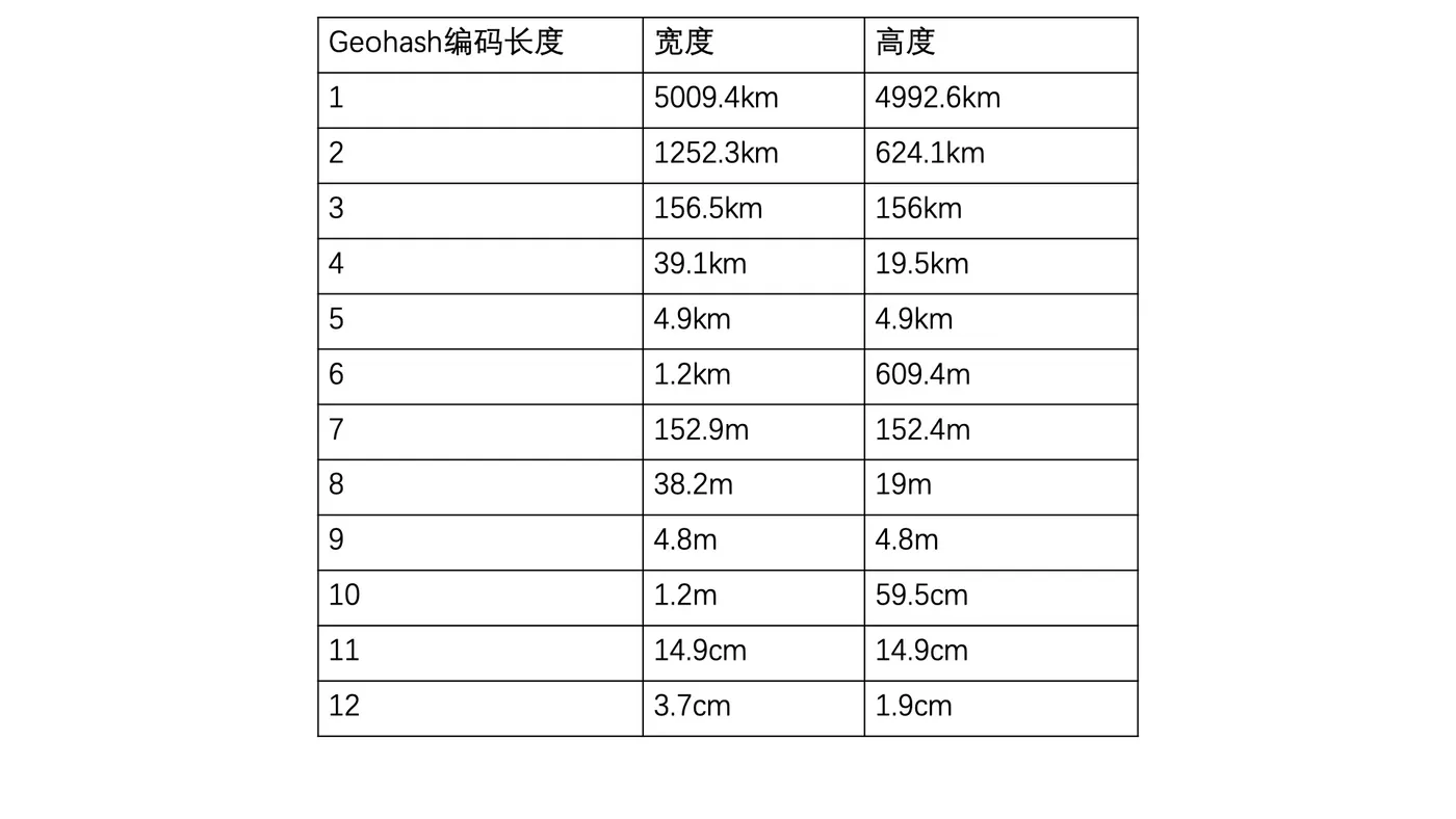 那在实际转换的过程中,由于不同长度的 Geohash 代表不同大小的覆盖区域,因此我们可以结合 GeoHash 字符长度和覆盖区域对照表,根据自己的应用需要选择合适的 Geohash 编码长度。这个对照表让我们在使用 Geohash 编码的时候方便很多。