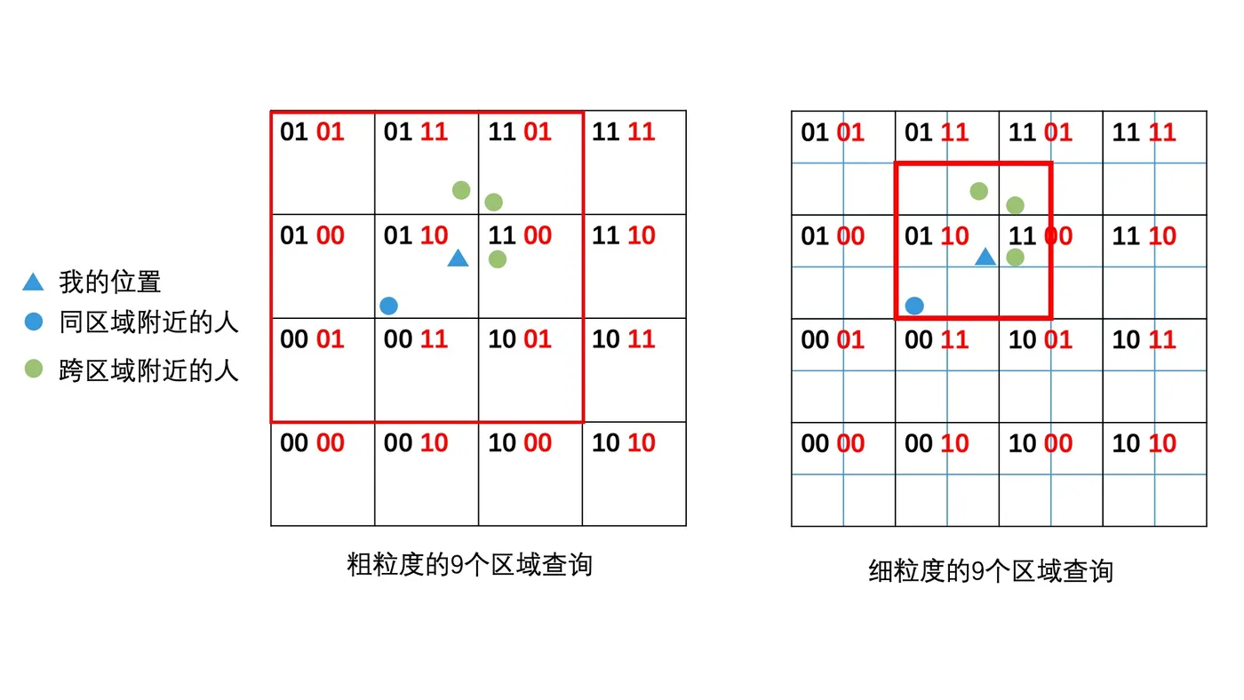 如果要降低计算量,我们可以将区域划分的粒度提高一个量级。这样,区域的划分就更精准,在查询半径不变的情况下,需要检索的用户的数量就会更少(查询范围对比见下图中两个红框部分)。