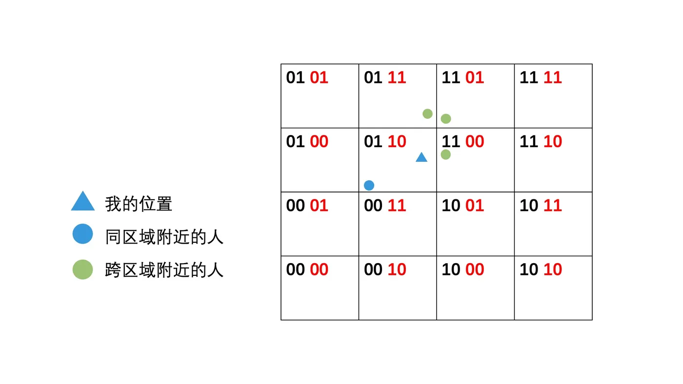 这样一来,当我们想要查询附近的人时,只需要根据自己的坐标,计算出自己所属区域的编码,然后在索引中查询出所有属于该区域的用户,计算这些用户和自己的距离,最后排序展现即可。