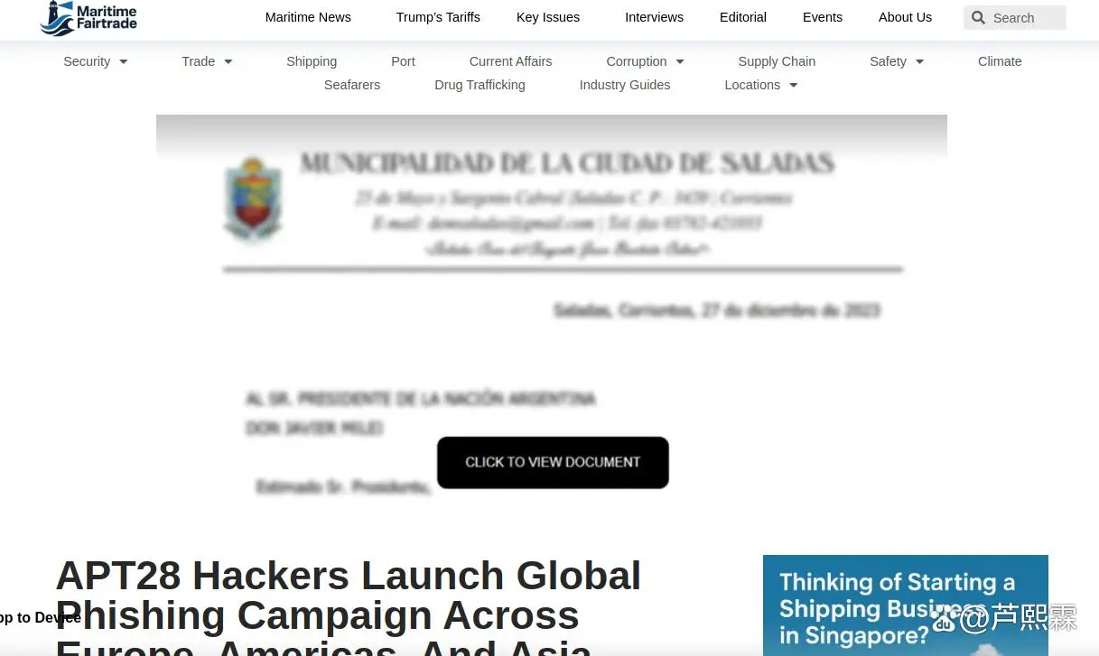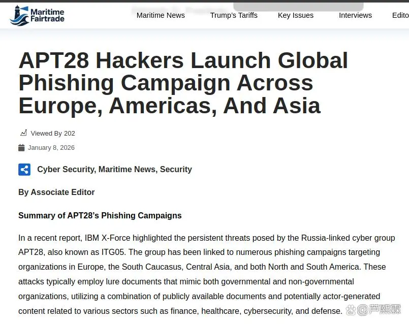 随着全球贸易对数字化与自动化依赖程度的加深,海事与供应链基础设施日益成为国家级网络攻击的重点目标。港口操作系统、船舶自动识别系统(AIS)、货运管理系统(TMS)及海关电子数据交换平台所承载的物流动态、货物清单与设施布局信息,不仅具有商业价值,更可能被用于推演军事后勤能力或干扰关键物资流动。在此背景下,俄罗斯关联的高级持续性威胁组织APT28(又名Fancy Bear、Sofacy、STRONTIUM)于2025年末启动新一轮全球钓鱼行动,其攻击范围覆盖至少12个国家,重点聚焦航运企业、港口管理机构及跨国供应链服务商。