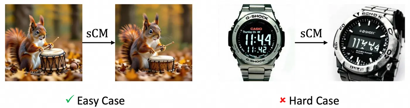 尽管Reverse-KL可以显著降低不合理样本的生成概率,其本身也存在严重的mode-collapse和分布过于锐化的问题[5]。具体表现在多样性降低,饱和度增加,形体增加等问题。这些问题在2步蒸馏的设定下变得尤为突出。为了缓解分布退化问题,常见做法是给模型一个更合理的初始化[6]。在这里我们使用PCM[7]蒸馏进行模型热启动。实验表明,热启动后的模型的形体扭曲问题得到明显改善。
